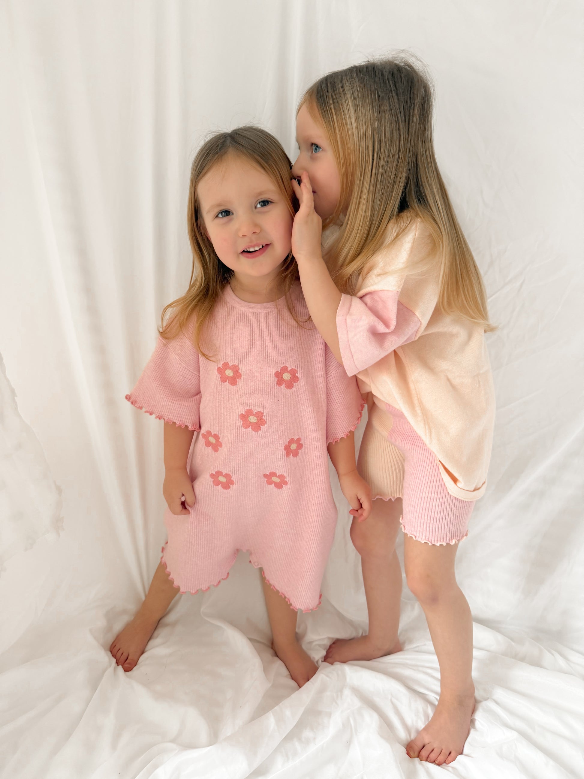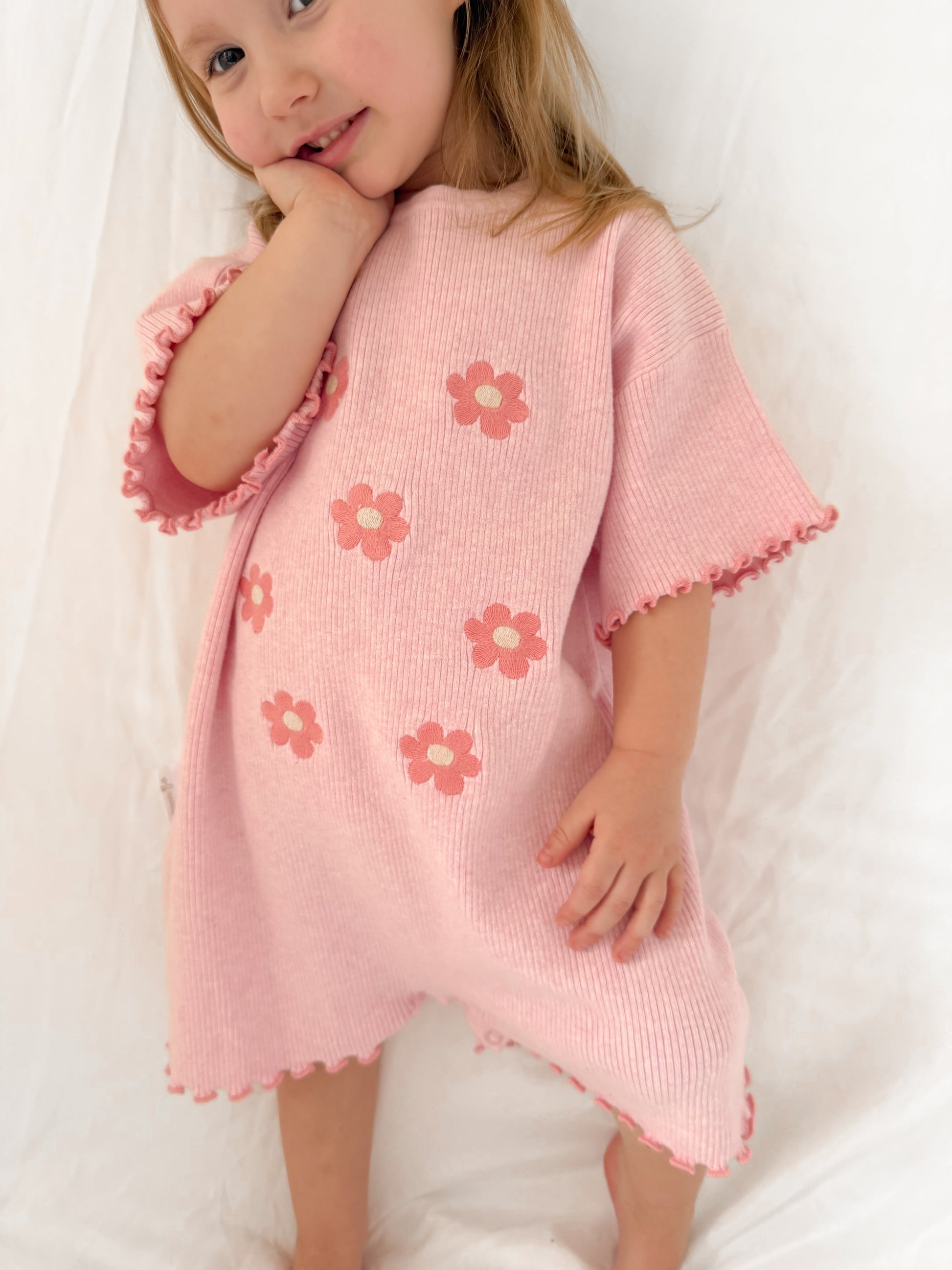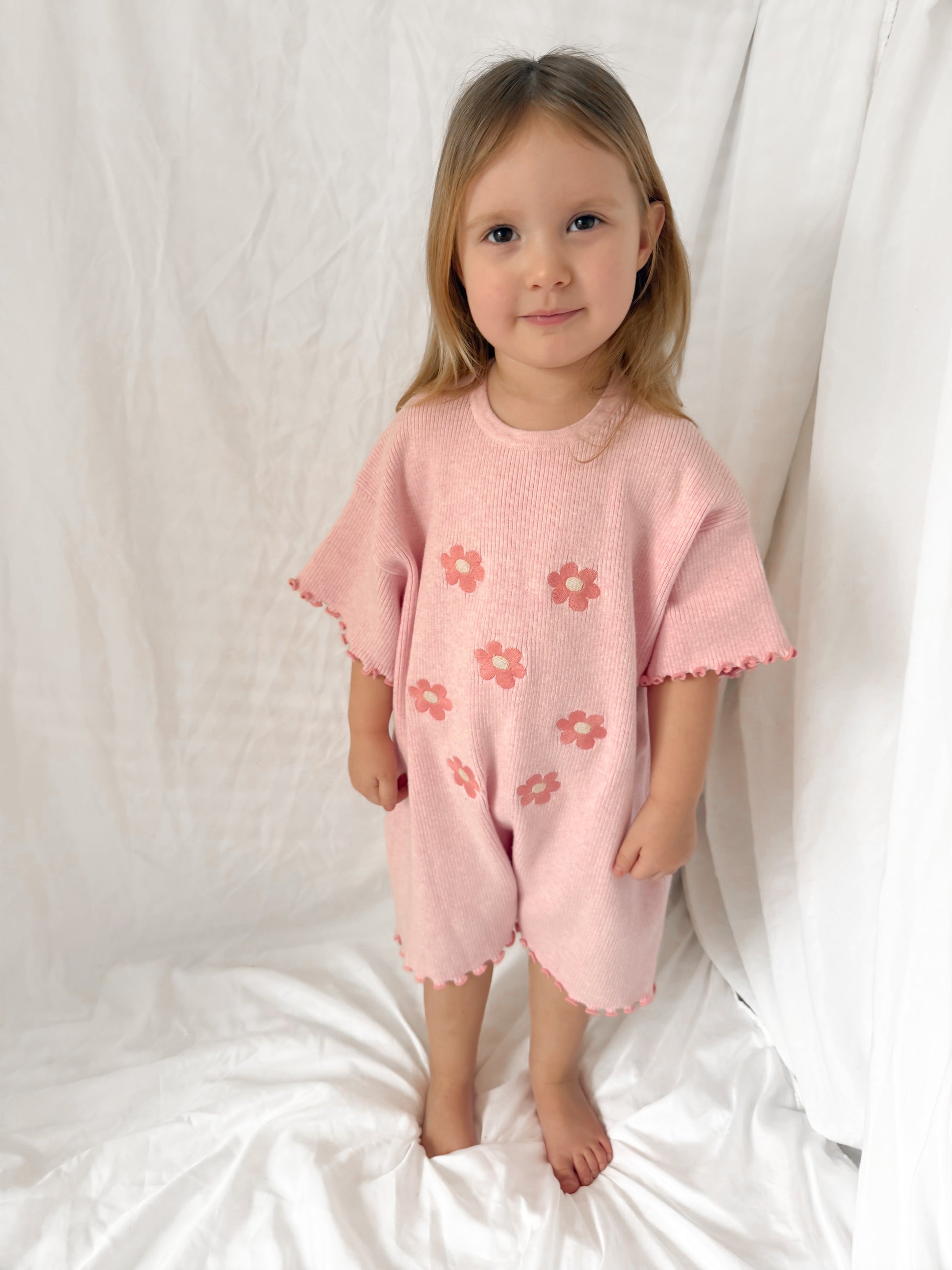 The most beautiful oversized playsuit you simply cannot miss out on! Gorgeous shades of pink and peach and the cutest flower embroidery. Matches perfectly with all other items in our Blossom collection. So soft, stylish and comfortable🩷Use code: SAVEALL to save £££ when you purchase the whole collection or 6+ items. Use code: BLOSSX2 to save money on matching sets. Just add your items to cart and enter the code you would like to use♡ Pre orders estimated to arrive mid-end April. Pre order now to guarantee your size♡