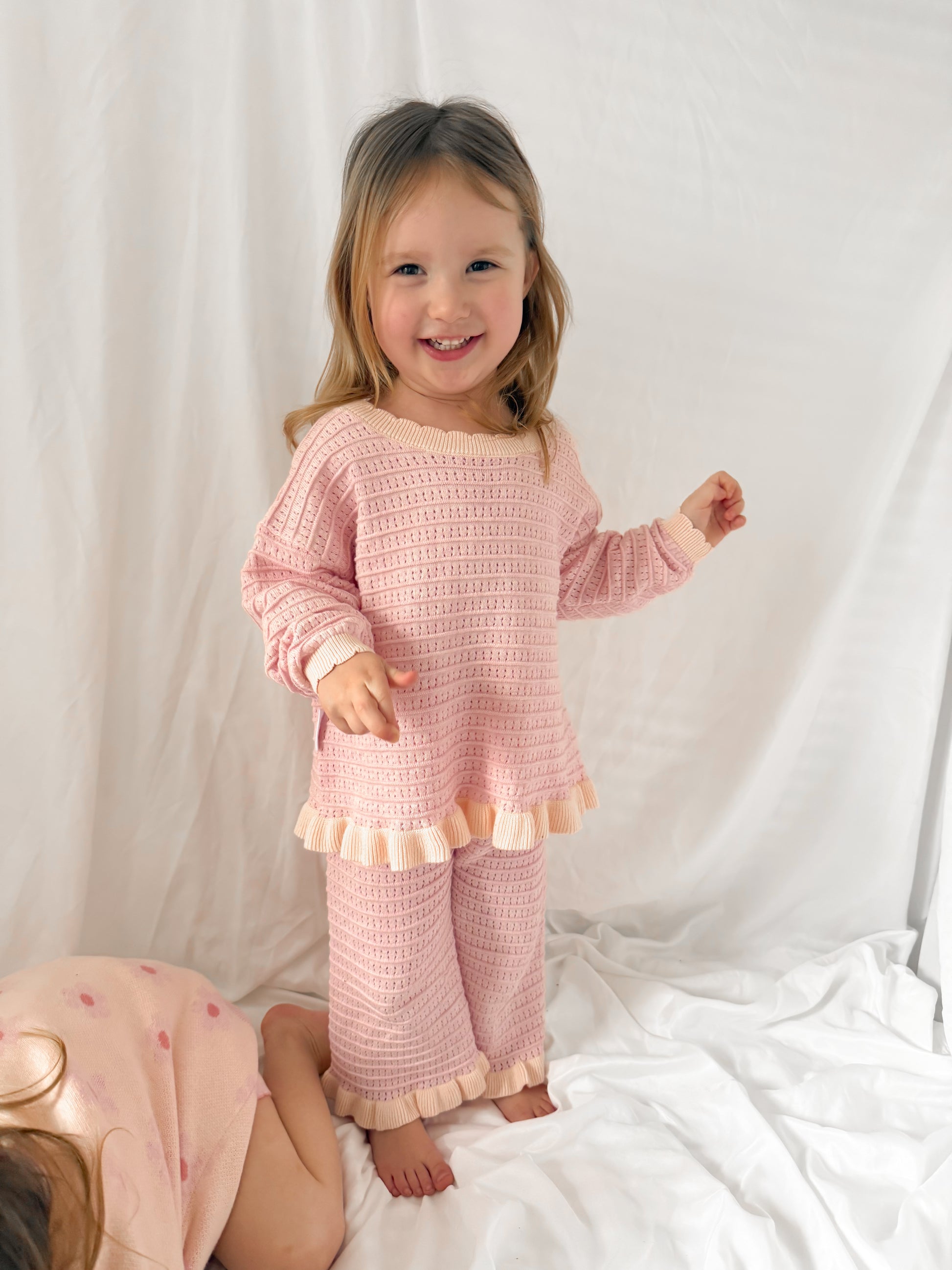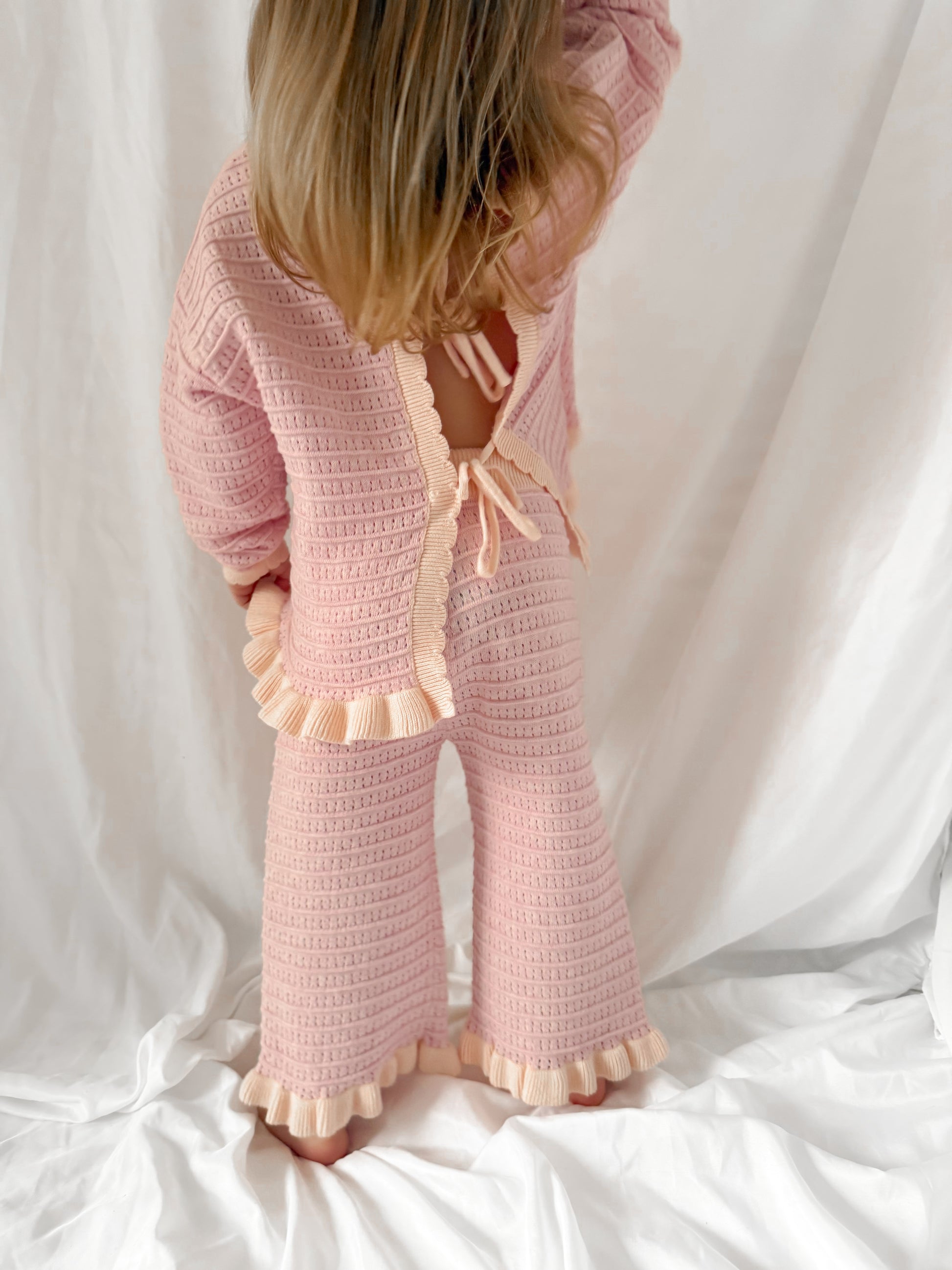 The most beautiful trousers that match perfectly with our Blossom tie back jumper and everything else in our Blossom collection. Gorgeous shades of pink and peach and the cutest frill edge detail. 🩷Use code: SAVEALL to save £££ when you purchase the whole collection or 6+ items. Use code: BLOSSX2 to save money on matching sets. Just add your items to cart and enter the code you would like to use♡ Pre orders estimated to arrive mid-end April. Pre order now to guarantee your size♡