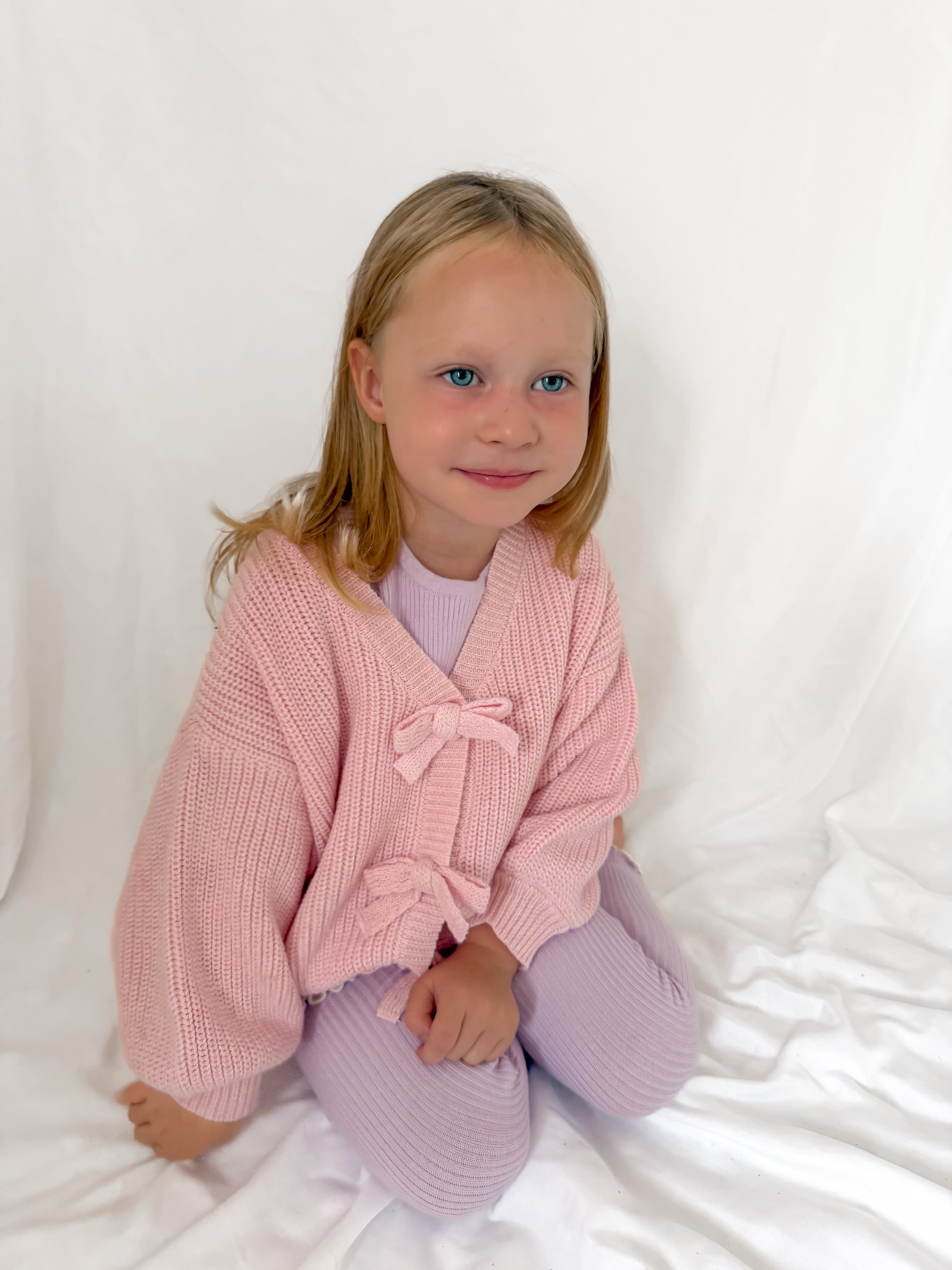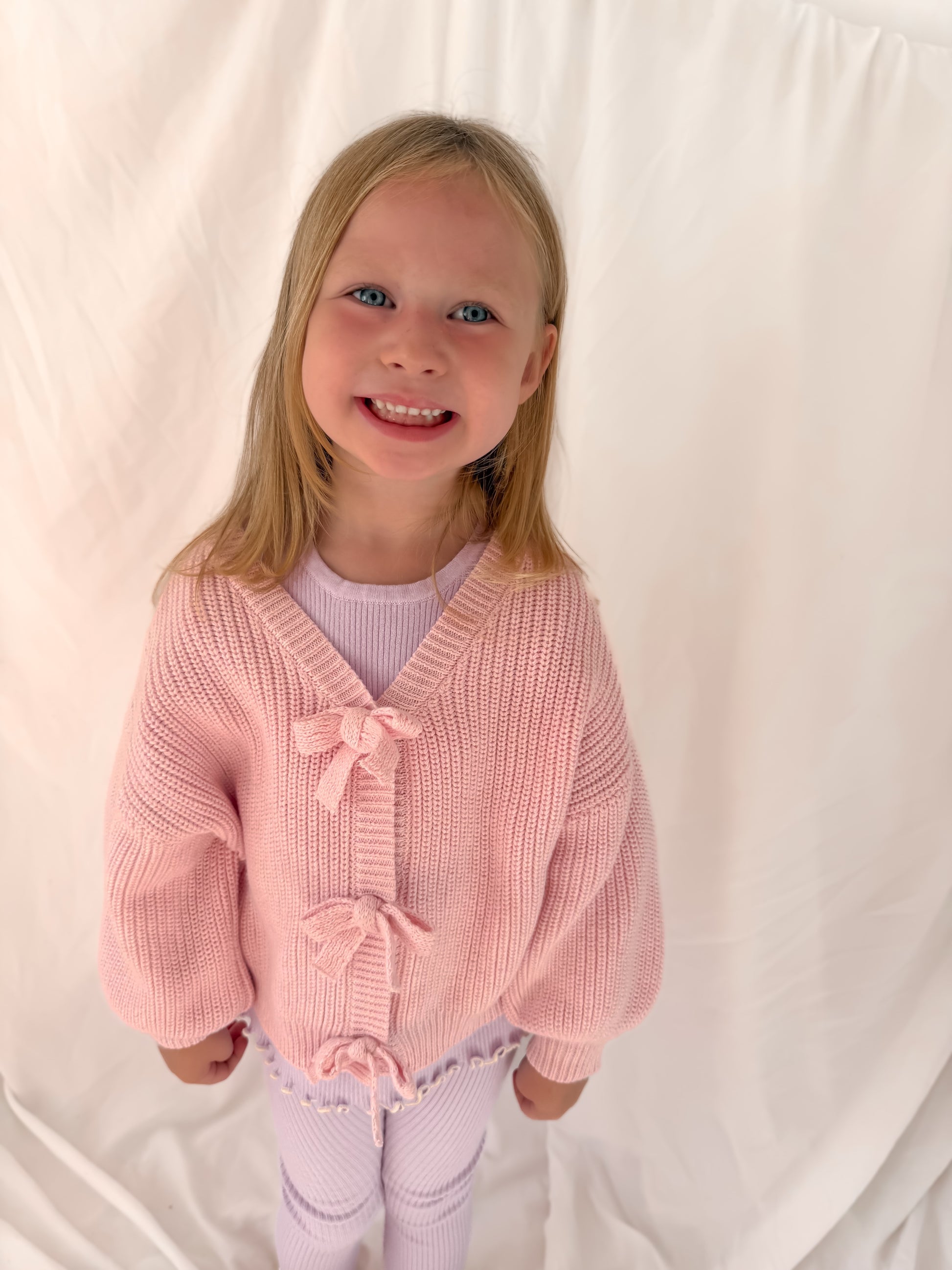 Layer up in our beautiful Posie bow cardigan. This chunky knit is the most beautiful shade of pink and white mix that matches perfect with our Posie leggings and top set. The cutest little details - bow snap buttons which will look absolutely adorable on your LO whilst keeping them warm and cosy. Made from 100% cotton, true to size. Pre orders estimated to arrive early January. Pre order now to guarantee your size♡